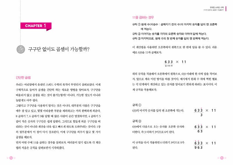 교육학자들은 트라첸버그 계산법이 수학 계산에 걸리는 시간을 80%나 단축시킨다고 말한다. <유대인 스피드 수학>은 크게 일곱 개의 장으로 구성되어 있다. 큰 줄기는 곱셈의 규칙과 빠르고 정확하게 계산하는 스피드 수학 특유의 계산법인 ‘직접 곱셈법’과 ‘UT 곱셈법’, 간단하고 빠른 나눗셈 방법과 제수가 긴 나눗셈 계산, 제곱과 제곱근 구하기다. 그리고 각 계산법에는 항상 정확하고 쉬운 검산방법이 포함되어 있다. 수학은 답을 구하는 것뿐 아니라 답이 정답인가 오답인가를 정확하게 검산하는 것이 가장 중요하다. 지금까지 우리가 해온 검산법의 오류를 밝히고 트라첸버그가 고안한 새로운 검산법을 활용하면 수학 계산에서 오류란 사라질지도 모른다. 마지막으로 미지의 수를 구하는 방정식 즉 대수학의 과정까지 풀어본다. 이 모든 과정과 계산법은 복잡한 기호와 숫자, 규칙 속에서 ‘수학은 어렵다.’는 고정관념을 갖게 된 이들에게 수학 앞에서 주눅 들지 않도록 해준다. 수학에 대한 감정적인 장애물을 극복할 수 있게 될 것이다.